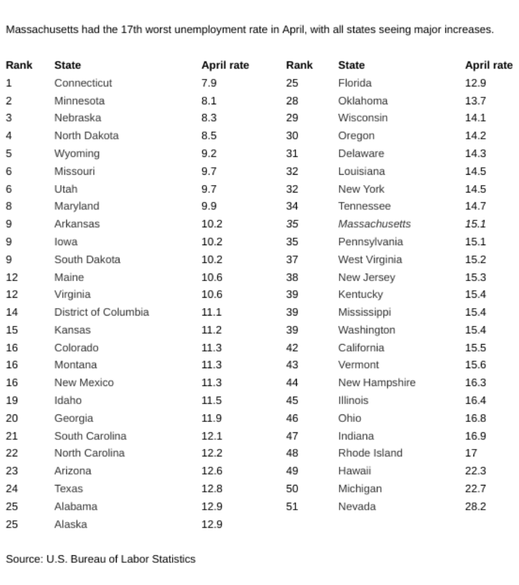 The flood of new unemployment claims made by hundreds of thousands of Massachusetts in the past few months have now made one more thing official: the state’s highest monthly unemployment rate since records started being kept in 1976.