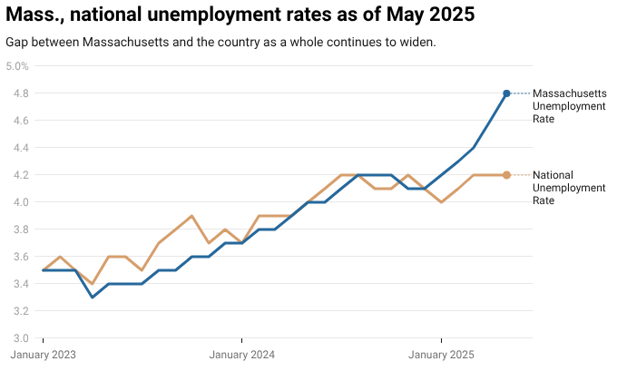 The unemployment rate in Massachusetts has been rising gradually for more than two years after hitting a low of 3.3% in April 2023, and it now stands at the highest level since September 2021.