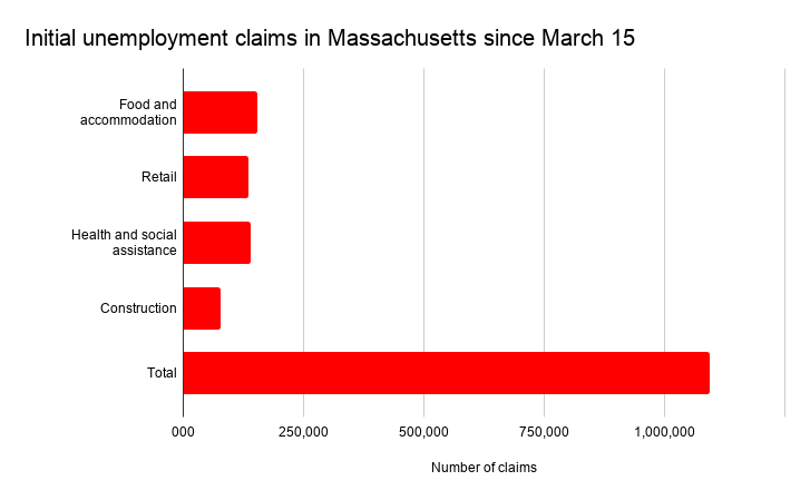Unemployment claims filed since the coronavirus pandemic began have increased to 1,093,079 in Massachusetts, according to U.S Department of Labor data released Thursday.