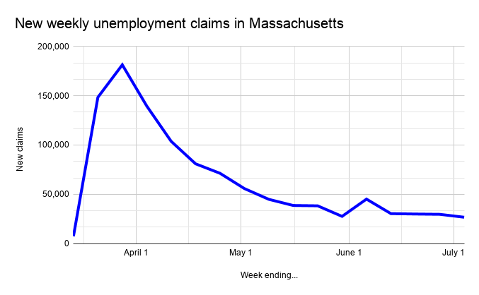 The unemployment number came before Gov. Charlie Baker announced the beginning of Phase 3 in Massachusetts. Step one of Phase 3 will include the reopening of the following establishments with restrictions: movie theatres and outdoor performance venues, museums, cultural, and historical sites, fitness centers and health clubs, certain indoor recreational activities (with low potential for contact), and professional sports teams, who can have games without spectators, with authority of league wide rules.