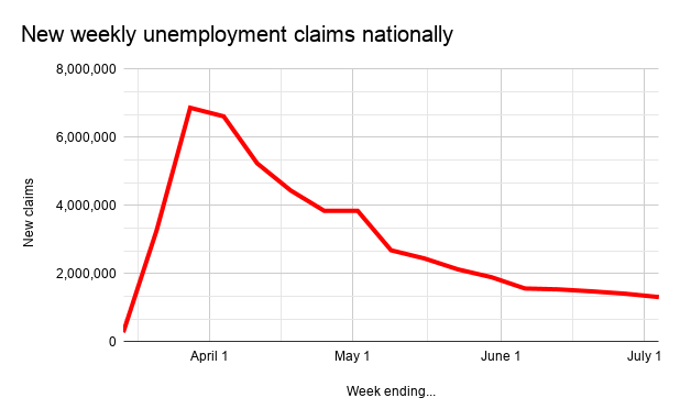 Three sectors in particular have been hardest hit since mid-March. Food and accommodation unemployment claims have totaled 153,307, retail has hit 135,514 claims, and health and social assistance stands at 138,723 through the week ending July 4.