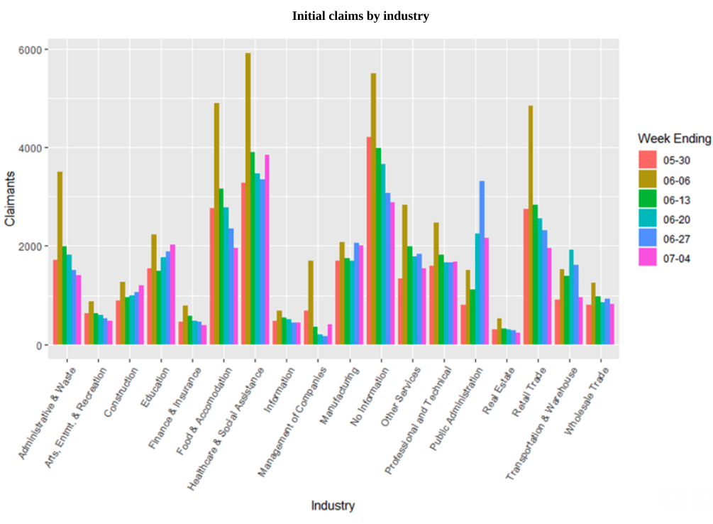 In the week ending July 4, new claims were highest in health and social assistance (3,840 new claims), public administration (2,168) education (2,028), manufacturing (2,010) and retail, food and accommodation (1,948 in both industries).