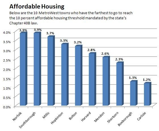 But not many communities in MetroWest have been able to get to the 10 percent level. According to the state’s Department of Housing and Economic Development’s sustainable housing inventory list, as of last month only five out of 40 communities in the MetroWest/495 corridor had more than 10 percent housing classified as affordable.