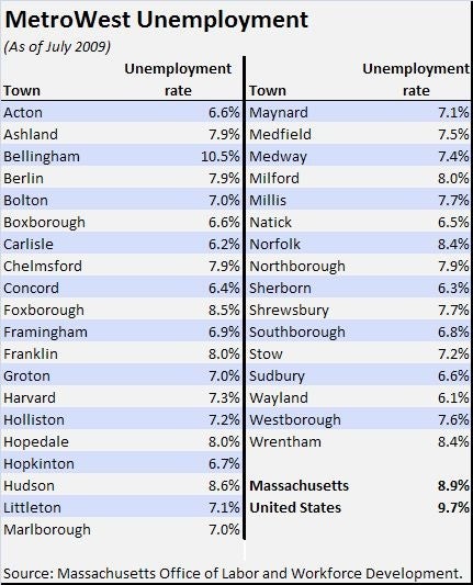 In MetroWest, Wayland, Carlisle and Sherborn had the lowest unemployment rates. All were in the 6.1 to 6.3 percent range.