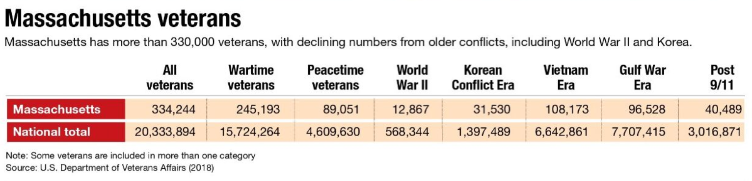 Of the more than 330,000 veterans in Massachusetts, 57% are 65 or older, according to the U.S. Department of Veterans Affairs. Less than 10% are 34 or younger. The state’s veteran population declines by more than 3% every year, and within two decades is expected to shrink to about 120,000, according to the VA.