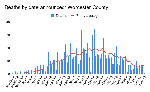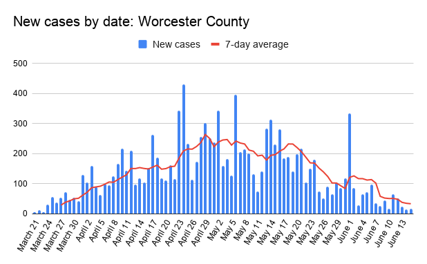 Worcester County reported 16 new coronavirus cases Monday and one death, which is the lowest one-day increase in the death toll since April 9, according to the Massachusetts Department of Public Health.