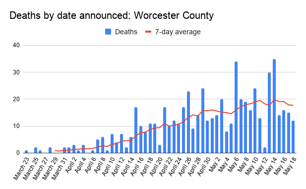 Worcester County recorded 12 new coronavirus deaths and 190 new cases Monday, according to the Massachusetts Department of Public Health.