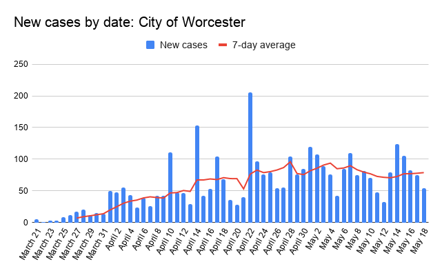 The City of Worcester reports 54 new cases, up 2%, bringing the total to 3,522.