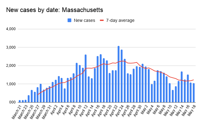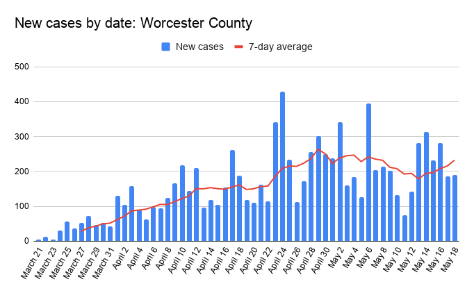 The new deaths in Worcester County bring the total to 581. Throughout Massachusetts there was a slight decline in daily coronavirus deaths with 65 new fatalities bringing the tally to 5,682. Â