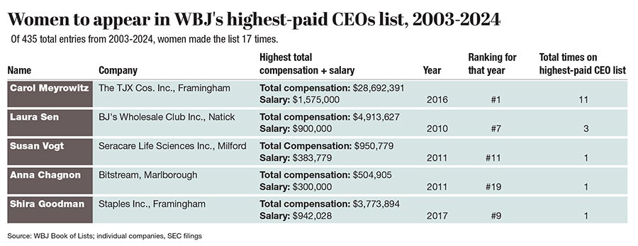 No female CEO has been among Central Massachusetts' highest-paid CEOs in the last six years, per data tracked by WBJ. Since 2003, TJX Cos. executive chairman Carol Meyrowitz, former president and CEO of the Framingham behemoth, was the lone woman among the highest-earning for seven of the 11 years a woman made the list. The year with the most women ranked was 2011 when Laura Sen of Marlborough-based BJ's Wholesale Club, Susan Vogt of SeraCare Life Sciences in Milford, and Anna Chagnon of Bitstream in Marlborough joined her on the list.
