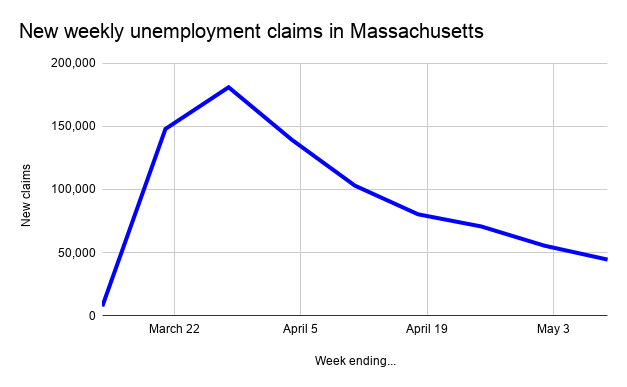 The latest Massachusetts data does have some good news: It’s the lowest weekly unemployment number in the past eight weeks, but it was a more than tenfold rise since the same week a year ago, when the economy was still strong.