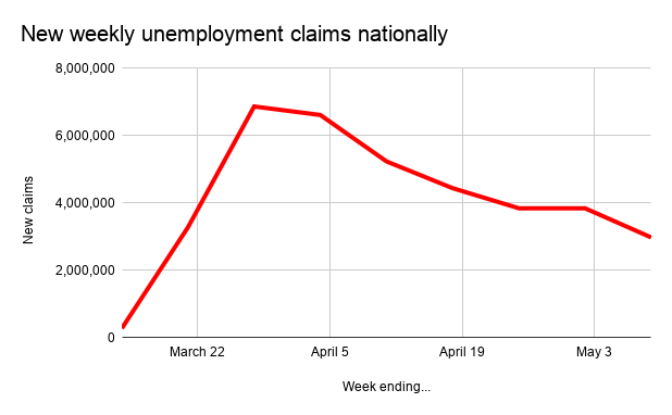 The 822,531 who’ve filed for unemployment in the last eight weeks accounts for 22.2% of the state’s 3.7-million-person workforce as of March.