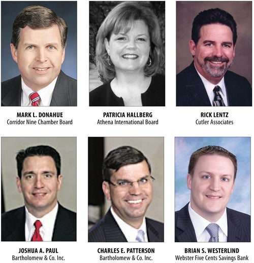 Corridor Nine Area Chamber of Commerce has elected MARK L. DONAHUE, director with Worcester-based law firm Fletcher Tilton PC, as chair of the chamber’s board of directors. Reelected to the board are: HENRY TESSMAN, director of sales and marketing of Doubletree Hotel; PAUL F. MCGRATH of Robert A. Cooper CPA; and DONNA COX, partner, Dynamx Financial Solutions. New to the slate of officers is vice chair STEVEN G. ANDERSON, vice president commercial lending, Unibank; and LINDA SEVIER, secretary, the owner of Pagetender LLC. The chamber also welcomed three new elected directors: BILL CONGDON, vice president and New England division manager, Wegmans Food Markets; KARYN POLITO, Polito Development Corp., and JOHN PRANCKEVICIUS, director of admininstration and finance, Massachusetts Port Authority.