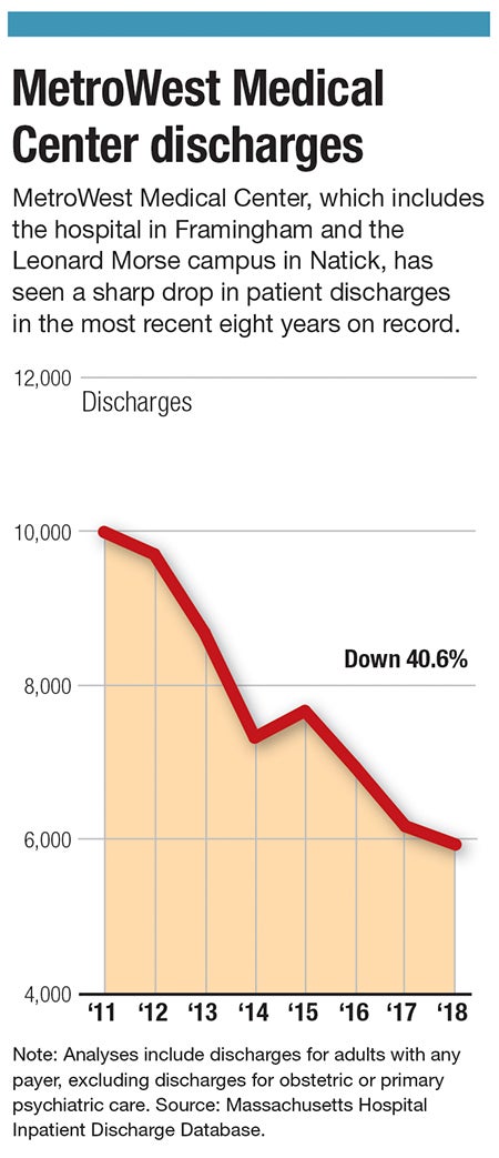 In the most recent five-year period on record with the Massachusetts Center for Health Information and Analysis, MetroWest Medical Center reported a 10% drop in patient discharges, compared with a median increase of 1% among cohort hospitals. Longer-term, the drop has been 41% in the most recent eight-year period, the sharpest decline of any hospital in Central Massachusetts.