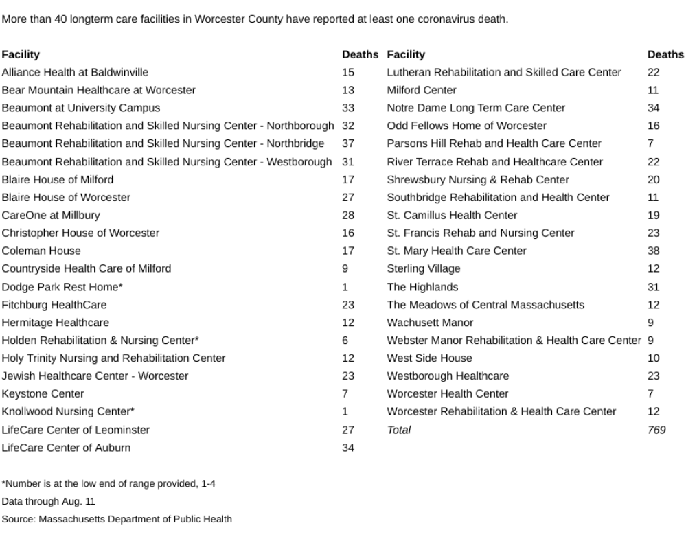 In all, 41 such facilities in Worcester County have reported at least one coronavirus death, and eight have 30 or more. Statewide, 377 long-term care facilities have reported at least one coronavirus death.