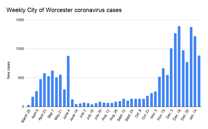 Worcester County had 3,532 new cases in the week ending Thursday, a 25% drop from the week prior, according to the Massachusetts Department of Public Health. The county now has a total of 55,257 cases since the pandemic began. Worcester has also dropped, with weekly city numbers falling by 27%. The city now has had 18,014 cases since the pandemic started, a weekly increase of 885.