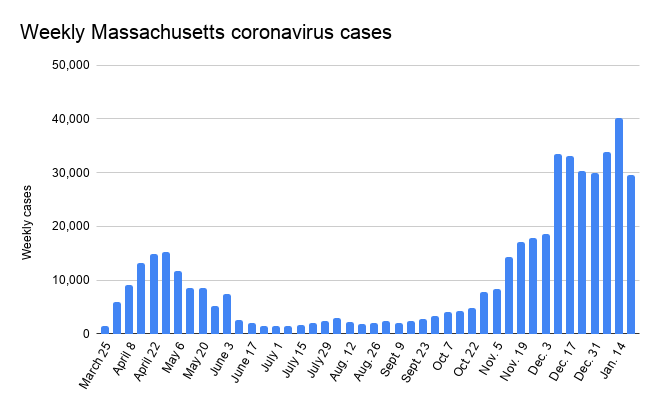 Statewide, cases are showing a similar decline. Massachusetts had 29,613 cases in the week ending Thursday, a one-week drop of 26% from what had been the state’s highest weekly case rate yet. Massachusetts now has 462,910 total confirmed cases.