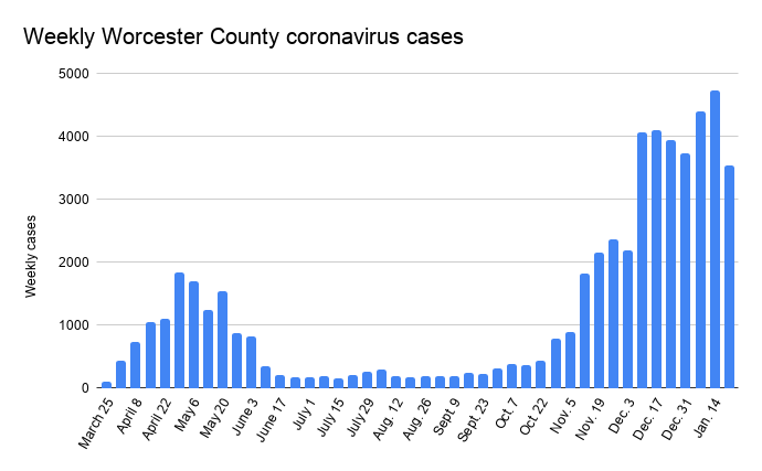 Deaths, which typically lag new cases by a few weeks, are also on a slight drop. Worcester County had 67 new reported deaths in the past week, down from 76 a week ago, to reach 1,744. The state recorded 466 new deaths in the past week, also a slight decline, to reach a total of 13,622.