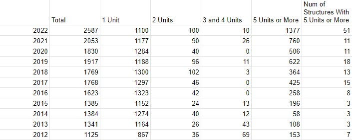 That number includes units of single-family homes as well as multi-family developments. The number of structures with five units or more grew to 51 from 11 in 2021, well higher than before the COVID-19 pandemic in 2019 when 18 structures were permitted.