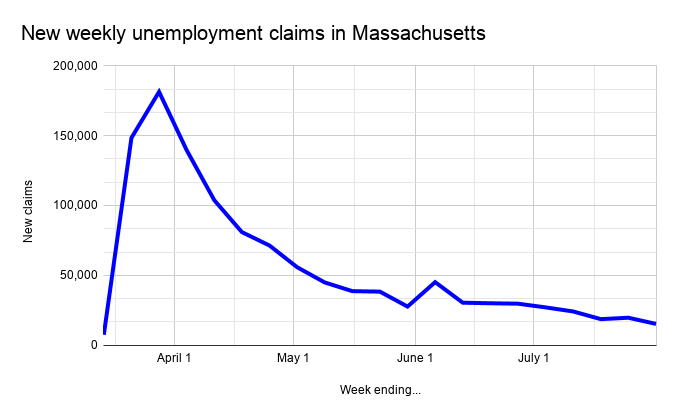 Still, the unemployment claims are multitudes higher than seen during a stronger economy. A year ago, 4,142 claims were filed in Massachusetts.