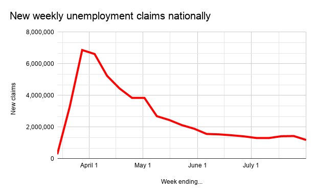 Nationally, unemployment claims topped 1 million for the 20th straight week. New claims also hit a new low across the country last week, with 1,186,000. Roughly 56 million unemployment claims have been filed nationally since mid-March.