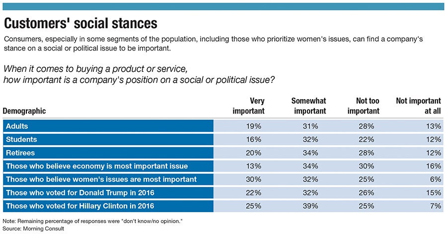 Exactly half of adults in a 2018 Morning Consult survey said they found it at least somewhat important what stance a company has on a political or social issue. Nearly as many said they’d want a share of revenue from their purchases to go to causes they believe in.