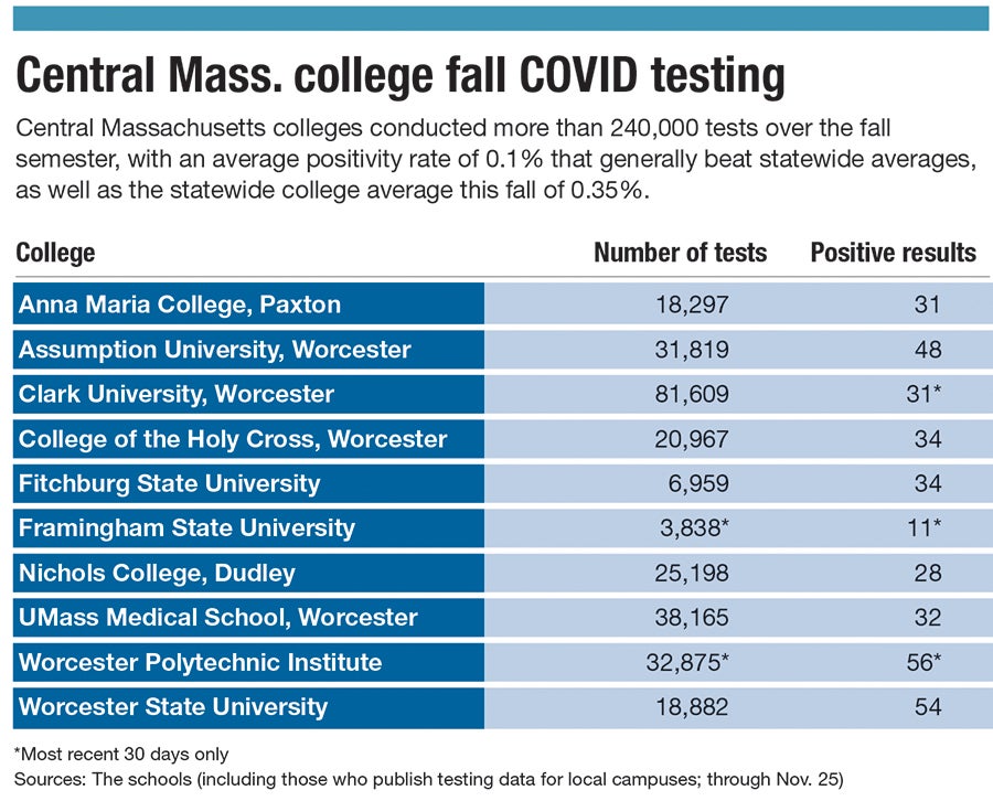 From August through late November, Nichols conducted more than 25,000 tests and had 28 come back positive – a rate of 0.1%. As the semester went on and other schools began moving courses online or restricting the movement of students – a list including Assumption and Clark universities, Worcester Polytechnic Institute, Worcester State University and Fitchburg State University – Nichols made it to its Thanksgiving break able to look back and exhale a bit that all the precautions largely worked.