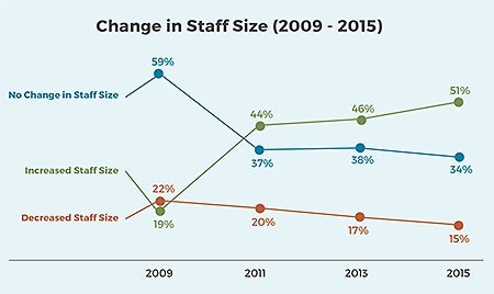 The study also found ongoing growth in the nonprofit industry, with 51 percent of organizations increasing their staff size in 2015, compared to only 19 percent in 2009 and 44 percent in 2011.
