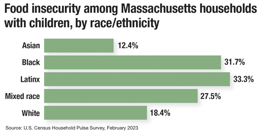 As of March, 22.2% of households with children in Massachusetts were food insecure, according to Project Bread. This is up from a pre-pandemic rate of less than 9%, and a mid-pandemic low of 12.5% in April 2021.
