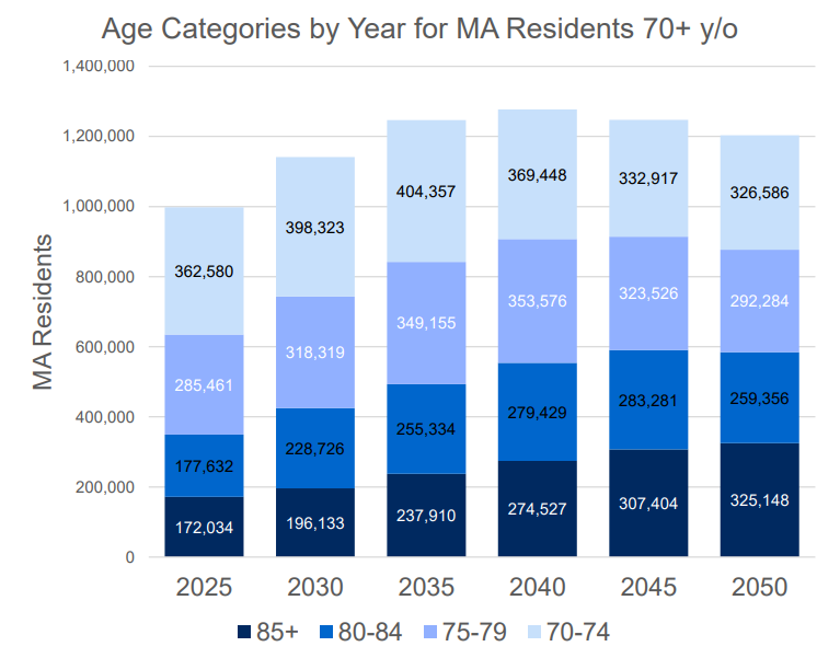 Massachusetts is currently home to 172,034 residents who are 85 and older, a figure that is projected to swell to 274,527 in 2040 and 325,148 by 2050, according to estimates from the UMass Donahue Institute.
