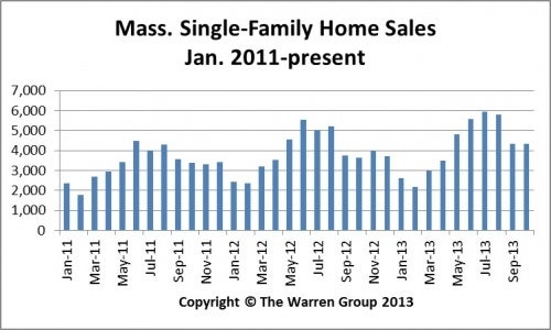 The median price for homes sold in the first 10 months of 2013 is more than 12 percent higher than 2012, The Warren Group said, while the median condo price is up 7 percent.