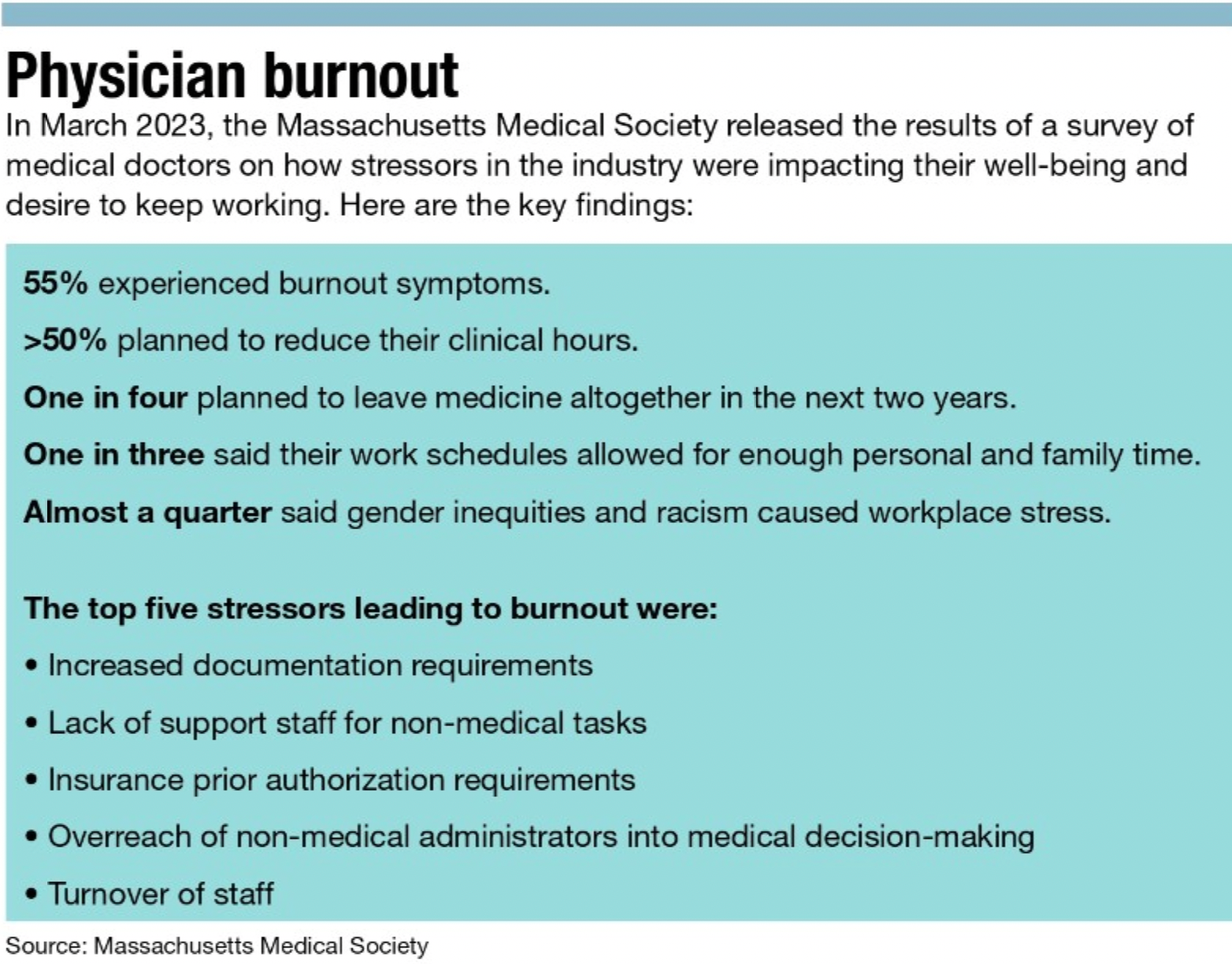 It takes 2.5 back-office staffers per physician to keep a practice running, he said. It’s costly, and finding good talent is difficult. The culprit is paperwork, even if technology has replaced paper and pen with check marks on a tablet.