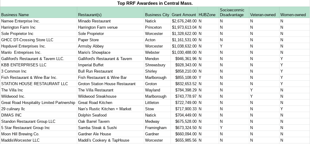 Before the program closed earlier in July, 306 Central Massachusetts businesses received more than $65.6 million in coronavirus federal aid from the Restaurant Revitalization Fund, according to data from the U.S. Small Business Administration.