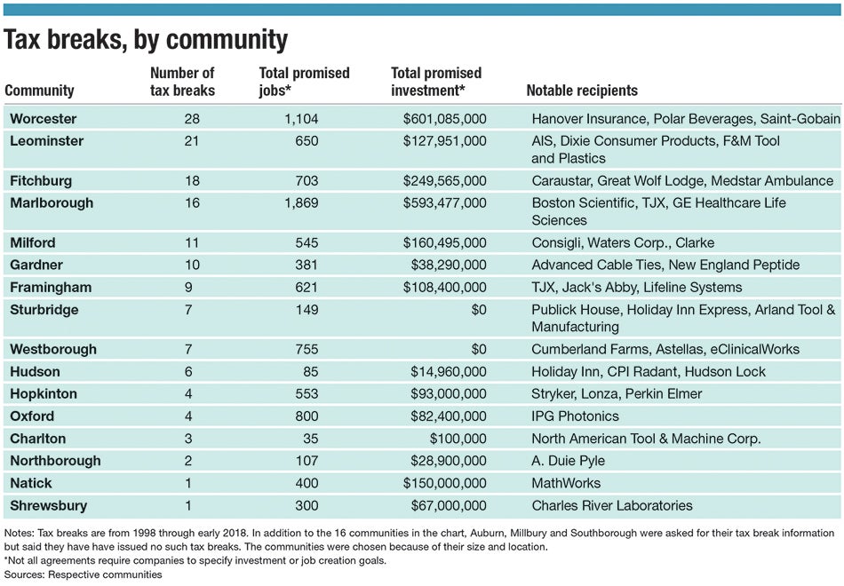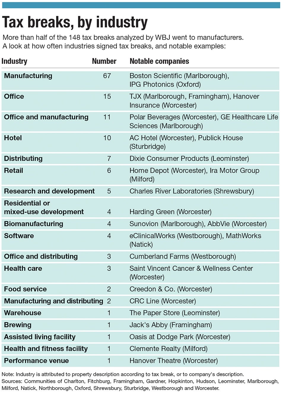 Tax breaks go to some of the largest companies in the Central Massachusetts: from Marlborough attracting medical device manufacturer Boston Scientific, to Worcester giving a break to longtime city employer Hanover Insurance Group for an expansion, to Milford helping medical software company Waters Corp. expand.