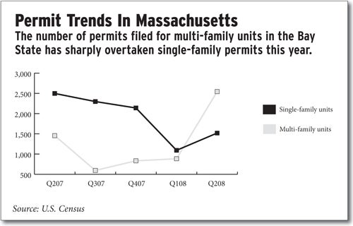 Yet in the second quarter of 2008, building permits issued for multi-family homes in Massachusetts rose 75 percent, according to census numbers.