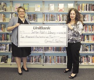 UniBank of Whitinsville donated $2,500 to the Sutton Public Library to fund programming for children, teens and adults, including a science magic show. Pictured, left to right, are: Betsy Rajotte, director, Sutton Public Library; and Traci Blecher, regional manager, Unibank.