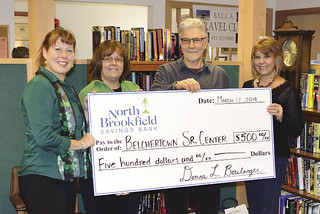 North Brookfield Savings Bank donated $4,000 to area charities with a contribution and community support. Five-hundred dollars went to Belchertown Senior Center. Pictured, from left to right, are: North Brookfield Savings Bank branch manager Tina Allen; assistant branch manager Pam Kozlik; Bill Korzenowski, executive director, Belchertown Senior Center; and Kim Rossi, the center’s transportation coordinator.
