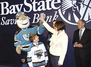 Worcester-based Bay State Savings Bank donated $4,500 to the Worcester Junior Sharks Youth Hockey Pre-Concussion Testing Program. Pictured, left to right, are: Finz, mascot, Worcester Sharks; Carson Domey, Junior Sharks member, Michelle Domey, coordinator of the pre-concussion program; and Peter Alden, president and CEO, Bay State Savings Bank. (Rear) Andrew Nawn, account executive, Worcester Sharks.