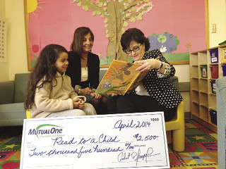 Framingham-based MutualOne Bank donated $2,500 to Read to a Child, which runs a lunchtime reading program at the Woodrow Wilson and Brophy elementary schools in Framingham. Pictured, left to right, are: an unnamed student; Rachel Stewart, administrative director, MutualOne Charitable Foundation; and Yasmine Ouweijan, manager of the bank’s Framingham/Concord Street office.