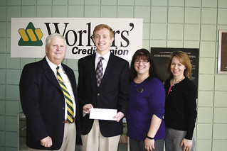 Fitchburg-based Workers’ Credit Union gave a $1,000 college scholarship to Acton-Boxborough Regional High School senior Zachary Zambarano. Pictured, left to right, are: David Rodgers, senior vice president, Workers’ Credit Union; Zambarano; Leslie Blair, Acton-Boxborough Regional High School branch supervisor; and JoAnn Campbell, school principal.