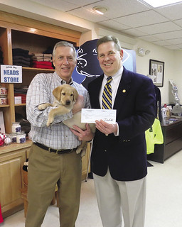 Wachusett Rotary Club donated $2,000 to NEADS/Dogs for Deaf and Disabled Americans. Pictured, left to right, are: Gerry DeRoche, CEO, NEADS; Rick Shaw, president, Wachusett Rotary Club; with Sasha, a puppy in training.