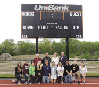 Whitinsville-based UniBank donated $21,745 for a new Uxbridge High School scoreboard. Pictured with students, from left to right, back row, are: Ernest Esposito, chairman, Uxbridge School Committee; Mark Donahue, retired athletic director; Tara Bennett, principal; and James F. Paulhus, president of UniBank.