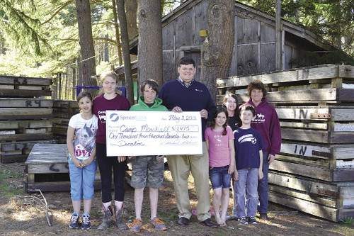 SpencerBANK donated $1,475 to fund five campers attending Camp Marshall in Spencer this summer. Pictured, left to right, are: Emma Willett, Jordan Desiletes, and Brent Cassavant, campers; K. Michael Robbins, president and CEO of SpencerBANK; Lexi Thayer, Jenna Broskey, and Mathew Broske, campers; and Jeanne Cassavant, center director, Camp Marshall.