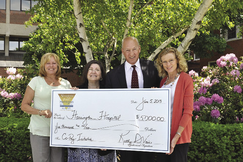Harrington Hospital in Southbridge donated $5,000 to help patients in financial need. Pictured, left to right, are: Deborah Howard, treasurer, Harrington Hospital Auxiliary; Kathy Vairo, auxiliary president; Ed Moore, president and CEO of the hospital; and Betsy Peppel, first vice president of the auxiliary.Â
