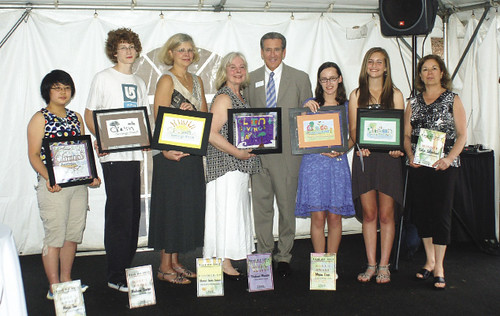 Clinton Savings Bank lauded art contest winners at its new West Boylston branch. Pictured, left to right, are: Marie Tan; Madison Suniga; Sheila Tetler of West Boylston Middle/High School; Susan Worth of Clinton Middle School; Robert Paulhus Jr., bank CEO; Megan Gage; Chloe Tolderlund; and Rachel Grabek of Chocksett Middle School.
