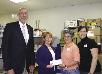 Community Foundation of North Central Massachusetts donated $7,429 to Loaves & Fishes food pantry in Devens, part of a matching grant program. Pictured, from left to right, are: Phil Grzewinski and Linda Mack of Community Foundation of North Central Massachusetts; and Lauren Farrell and Theresa Wilson of Loaves & Fishes.