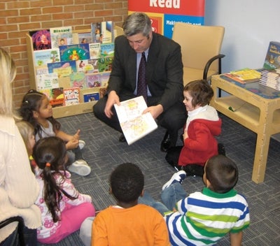 State Rep. Vincent Pedone, D-Worcester, recently visited Plumley Village Health Services in Worcester and read to a group of young children as a way of emphasizing the importance of parents reading out loud to their children. Plumley Village Health Services is an active participant in Reach Out and Read, a national literacy program aimed at children that are at risk of entering school unprepared to learn. Pictured is Pedone with a group of children at the Worcester health center.