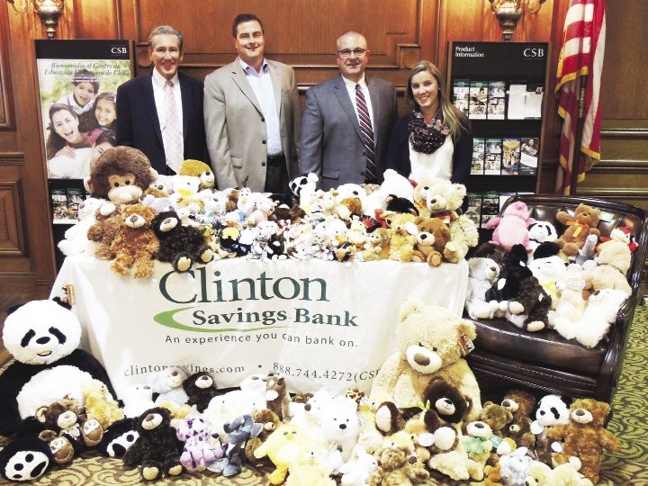 BEARY GENEROUS Clinton Savings Bank presented about 150 employee-donated teddy bears to Bears on Board Inc. to provide to children in need of comfort. Pictured (from left) are Robert J. Paulhus Jr., president and CEO, Clinton Savings Bank; James Pietro, co-founder, Bears on Board; and bank employees Dave Harmon and Christal Pond, who led the collection effort. .