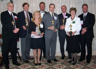 The Corridor Nine Chamber of Commerce recently held its annual dinner and honored several local business leaders. Pictured, from left to right, are: Davis Cox of Dynamx Financial Solutions in Northborough; Rod Stull of AstraZeneca LP; Deborah Penta of Penta Communications in Westborough; Dave Jacobs of Office Depot; Ed Lopes of Grafton Suburban Credit Union in Grafton; Dave Glispin of Sunshine Sign Co. in North Grafton; Maureen McDowell of Fletcher, Tilton & Whipple PC in Worcester; and Corridor Nine Chairman Dave Bagdon of Community Advocate.