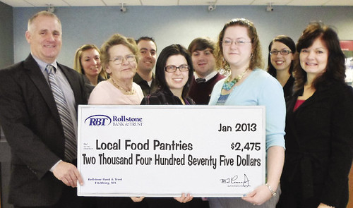 Fitchburg-based Rollstone Bank & Trust donated $2,475 to three area food pantries. Pictured, from left to right, (front row) are: Jim Adams, vice president, Rollstone Bank & Trust; Ginny White of Ginny’s Helping Hands; Joana dos Santos, executive director, Cleghorn Neighborhood Center; Kristina Wilson, director, Townsend Ecumenical Society; Heather Sarasin, bank branch manager. Back row: the bank’s Nicole Kalloch, Nick Caravella, Robert Courtemanche and Heather Finnerty.